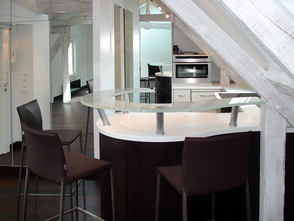 Cuisine contemporaine, dos de meuble galbé en chêne teinté wengué, portes laquées, plateau en corian, tablette snack en verre.