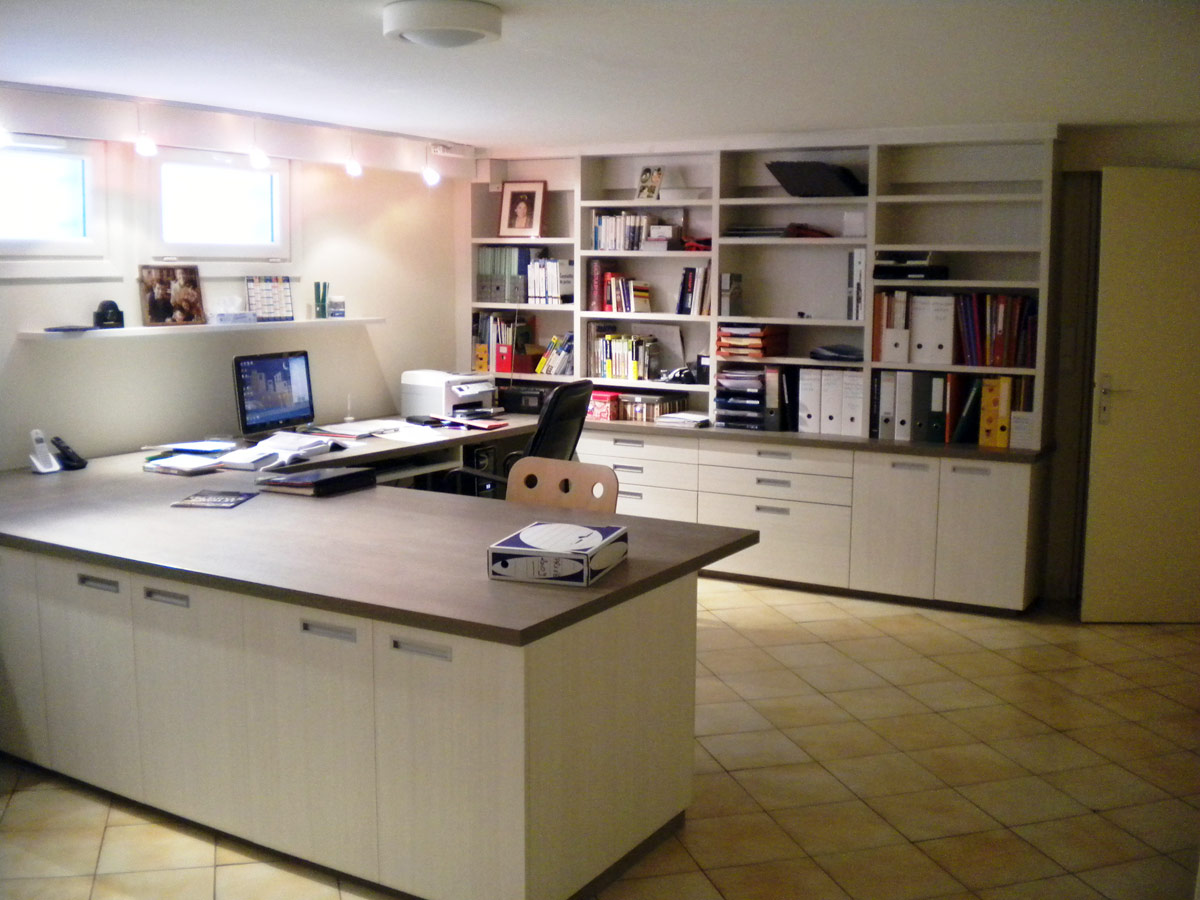 Mobilier de bureau : meubles en mélaminé décor avec chant ABS, plateau stratifié, ilot central avec plateau coulissant pour utilisation plateau débordant ou accès placards alternativement.