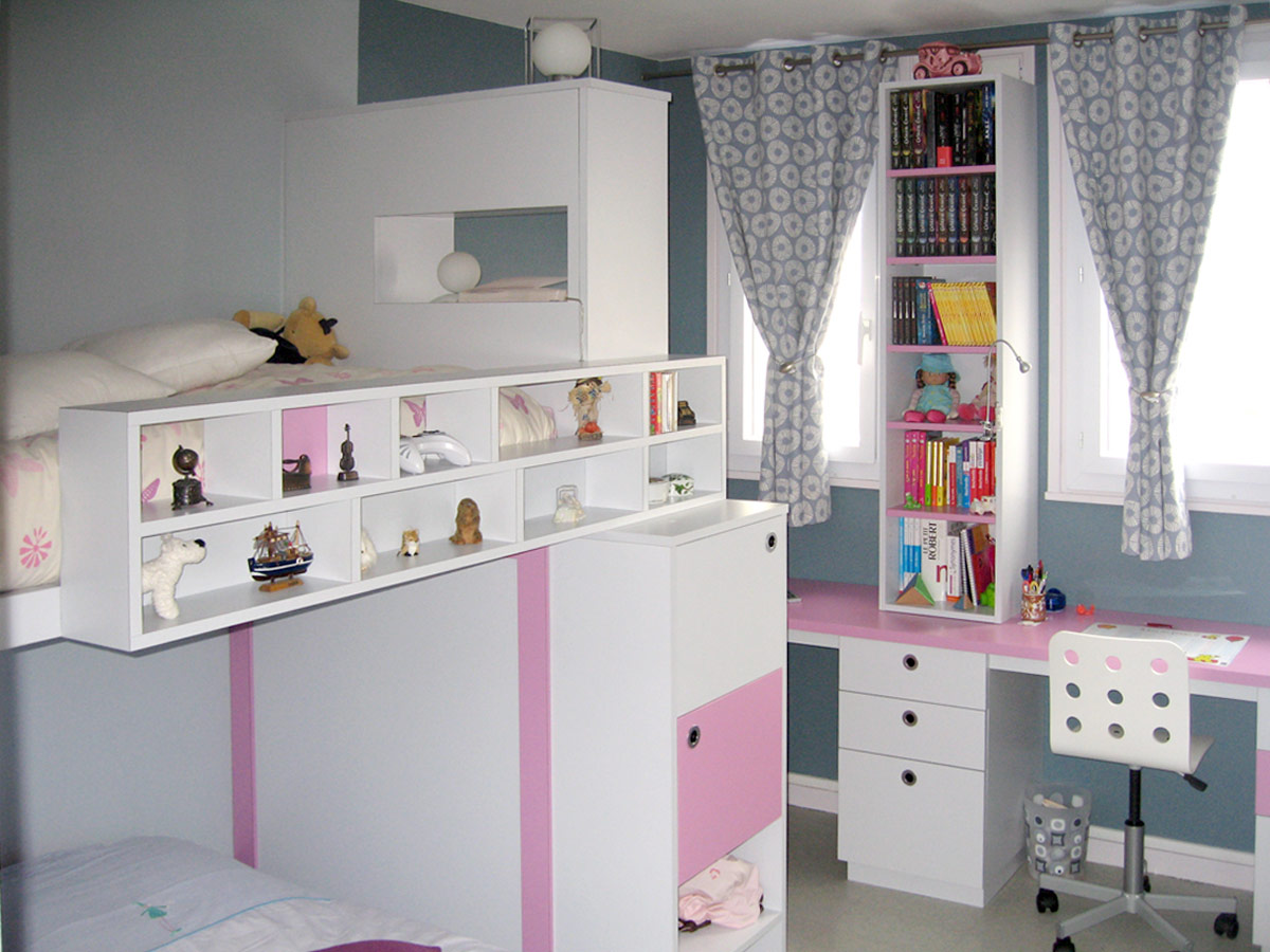 Mobilier d'enfant avec 2 zones couchages, 2 zones bureaux et rangements divers.