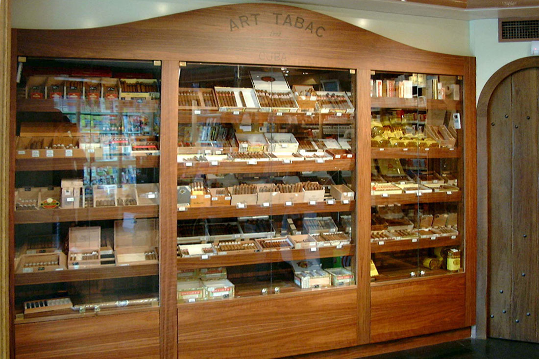Meuble présentoir à cigares, spiritueux et comptoir.