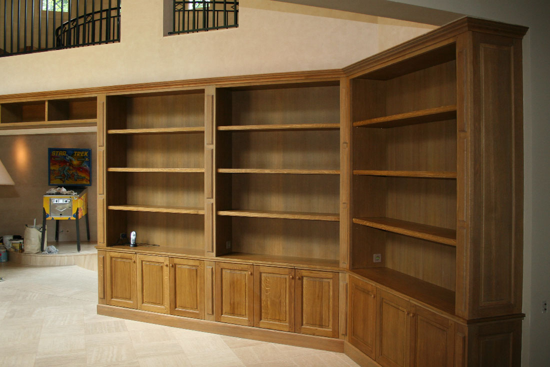 Bibliothèque en chêne avec portes basses et côtés à panneaux plates bandes, socle, colones pilastre et corniche en chêne massif, tablettes plaquées chêne avec alèses massives.