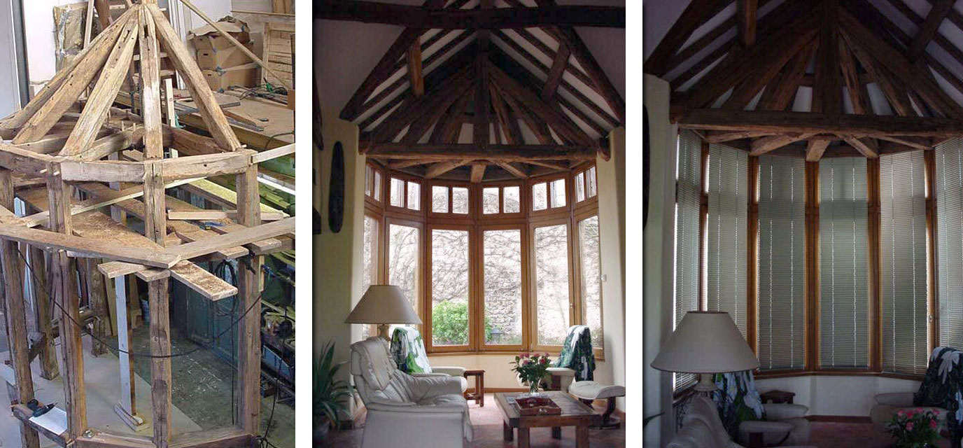 Fabrication d'une tourelle à base de poutres chêne vieux bois de démolition avec travail d'assemblage sur atelier.