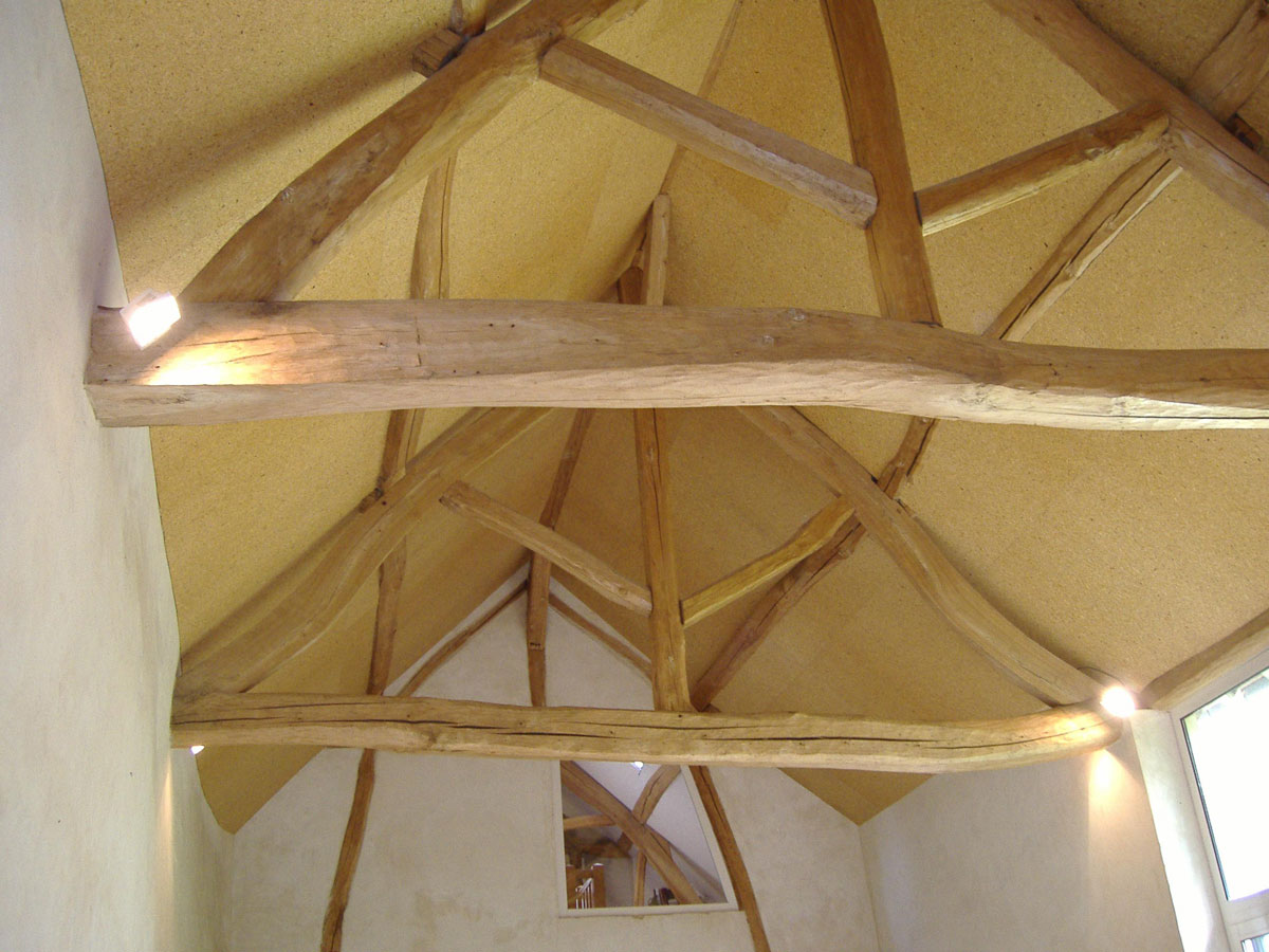 Isolation sous toiture d'une grange existante avec finition par panneaux bois type OSB.