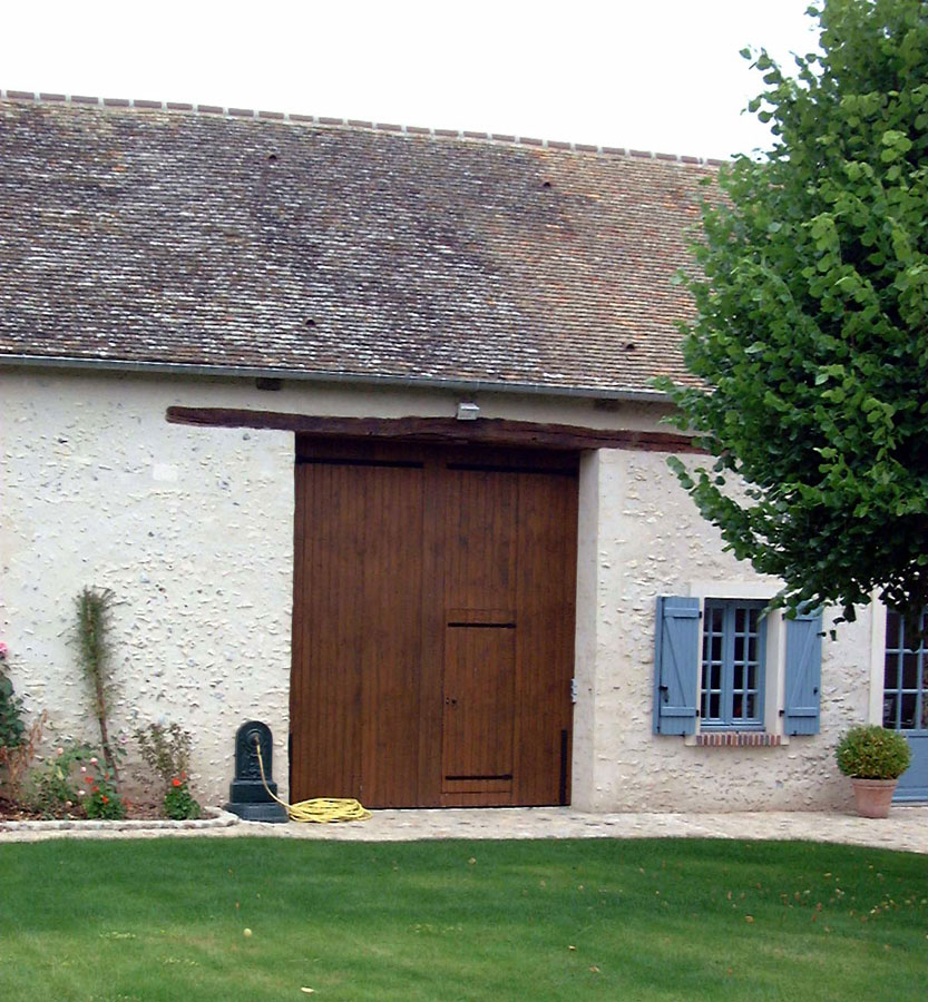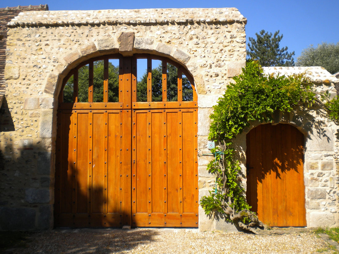 Portail en chêne avec pentures et clous à tête pointe de diamant. Imposte ajourée semi fixe : condamnation ouvrant avec les 2 vantaux du portail.